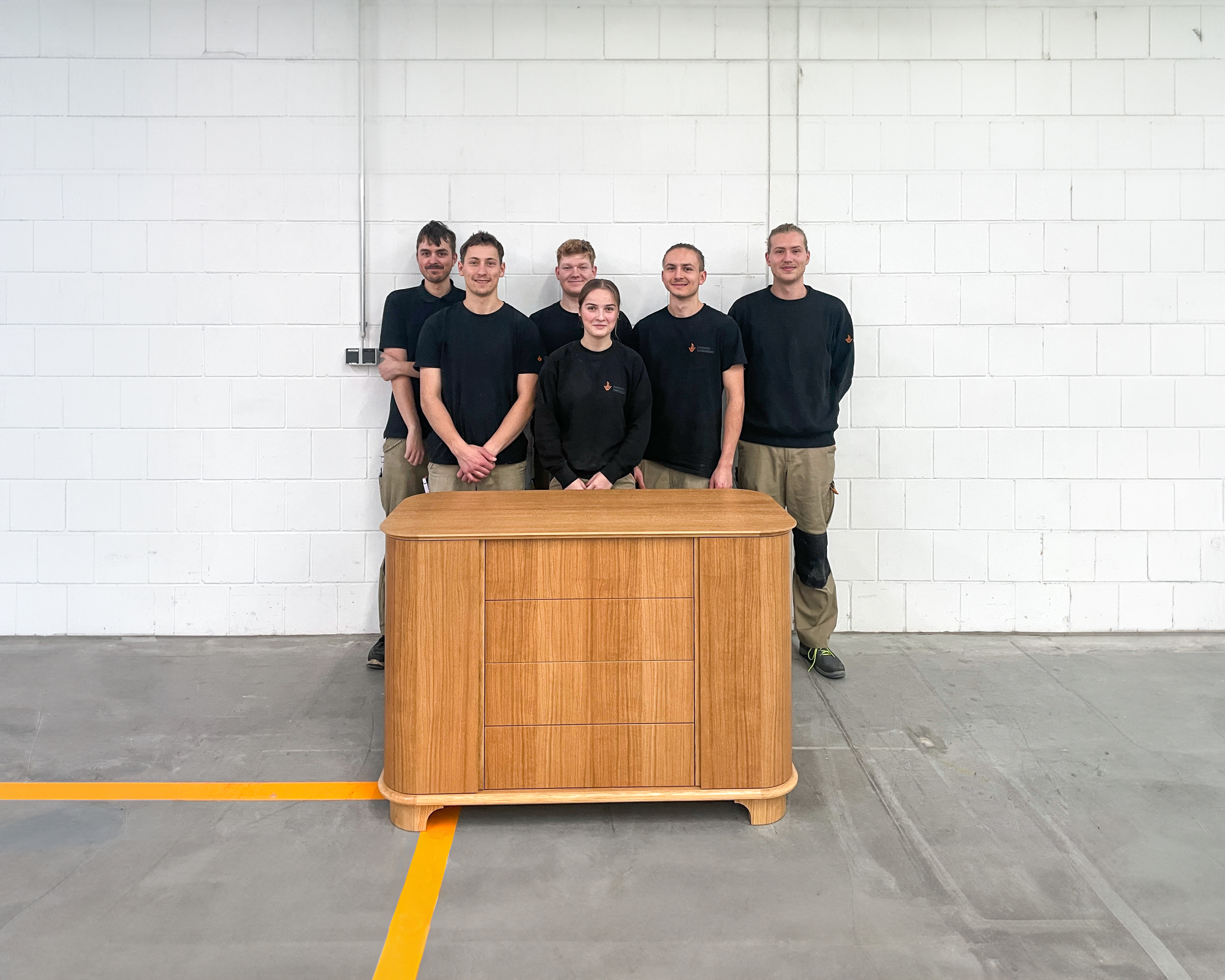 In diesem Jahr ist es ein Sideboard geworden, das sowohl an der Wand als auch offen im Raum stehen kann. Das Design besticht durch ein charmantes Zusammenspiel von klassischer und moderner Formensprache. Gefertigt wurde das Möbel aus massiver Eiche und mit Eichenfurnier belegten MDF-Platten. Die runden Formteile wurden in der Vakuumpresse mit Biegesperrholz verleimt. Die Schubkästen sind handgezinkt, zurückgesetzt und mit Push-to-Open-Vollauszügen ausgestattet. Die Türen mit Griffprofil werden mittels überfurnierten Magneten zugehalten. Die Oberflächen haben die Lehrlinge mit seidenmattem Klarlack veredelt.