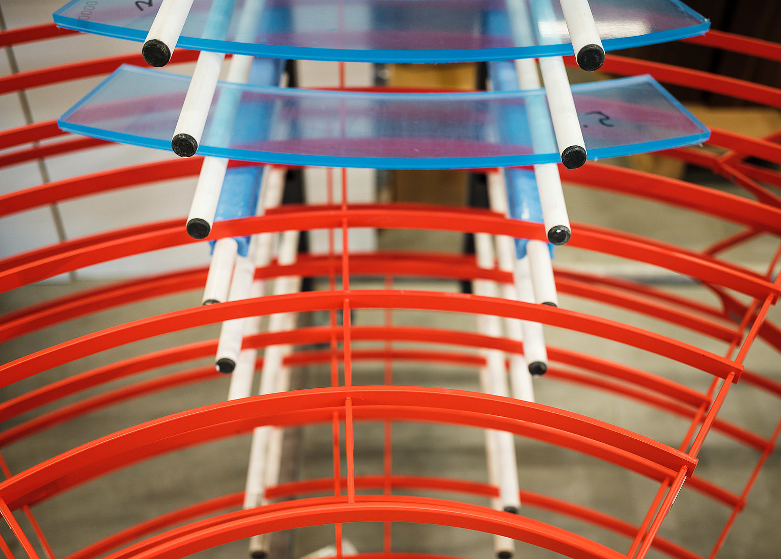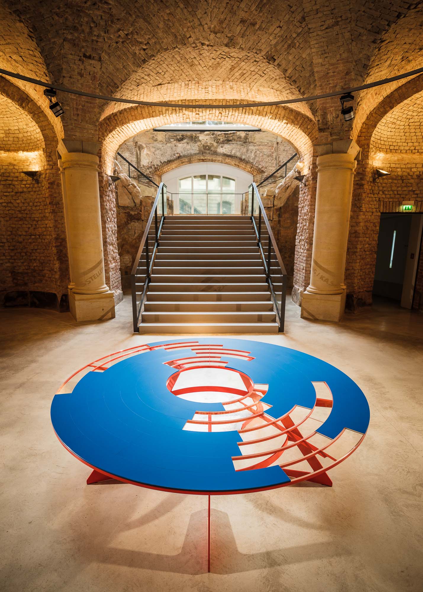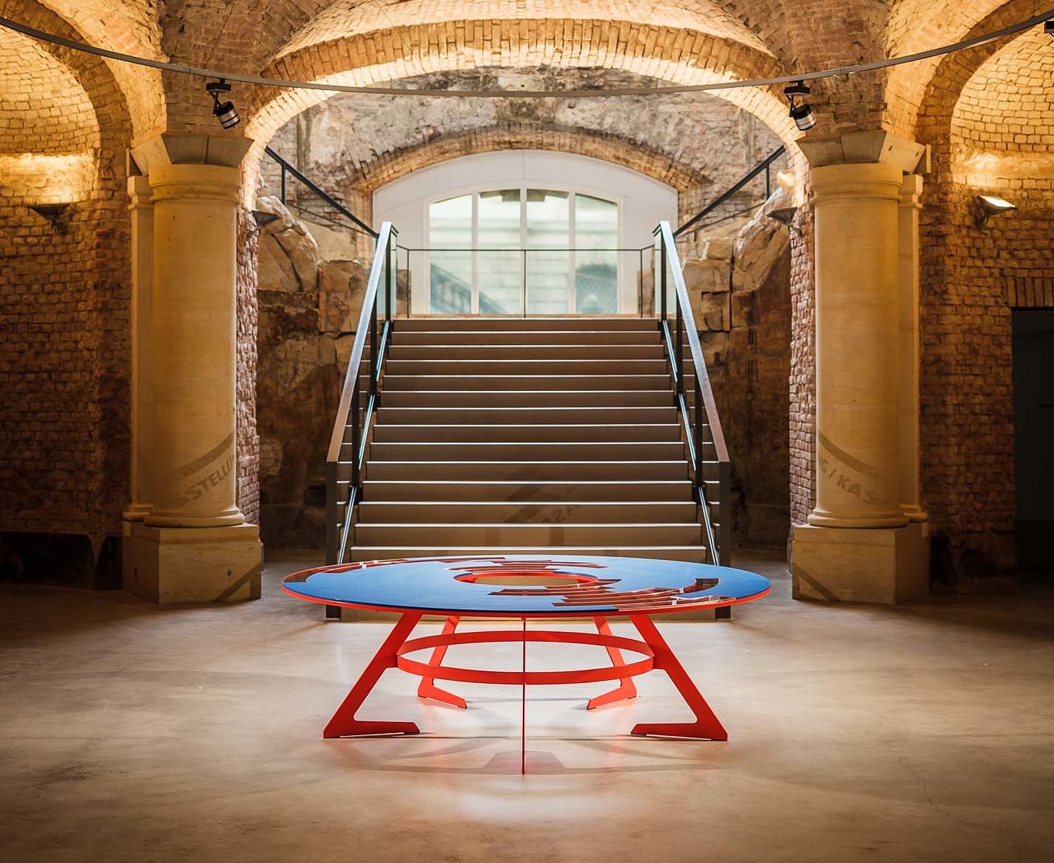 Nach dem Entwurf von Designer Gabriel Bensch ist ein Tisch ohne geschlossene Platte entstanden, der aus verschiedenen Ringelementen besteht. Diese können in unterschiedlichen Positionen montiert werden. Wie in der deutsch-deutschen Designgeschichte gibt es Lücken und Brüche, aber auch Verbindungen und Überlagerungen. Die starken Rot- und Blautöne greifen die Farben des Ausstellungskataloges auf.