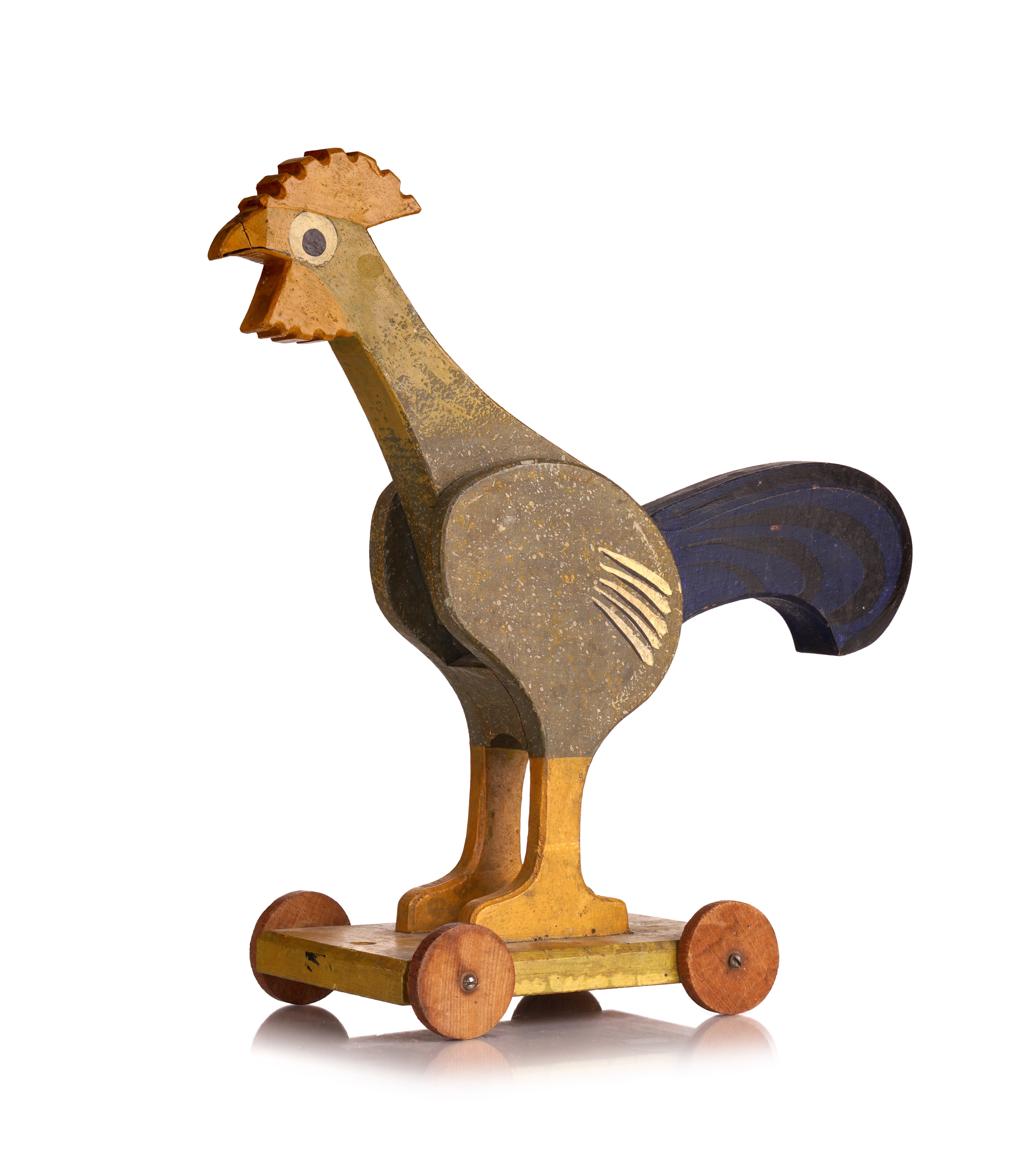 Ab 1902 kam das neu entwickelte Reformspielzeug auf den Markt. Herstellungsort war Schmidts Geburtsstadt Zschopau. Die Spielzeuge sind selten geworden, 100 Jahre Benutzung hält selbst das robusteste Produkt nicht aus. Umso mehr freut es uns, dass das Kunstgewerbemuseum Pillnitz vom Dresdner Kunstauktionshaus Schmidt jetzt einen Hahn erwerben konnte, der gegen 1907 hergestellt wurde. Der Entwurf des Nachziehtiers stammt von August Geigenberger. Damit ist dem Sammlungsbestand Deutsche Werkstätten wieder eine Facette hinzugefügt worden. Das Schaudepot kann wieder ab Mai, nach der Winterpause, in Pillnitz besichtigt werden.