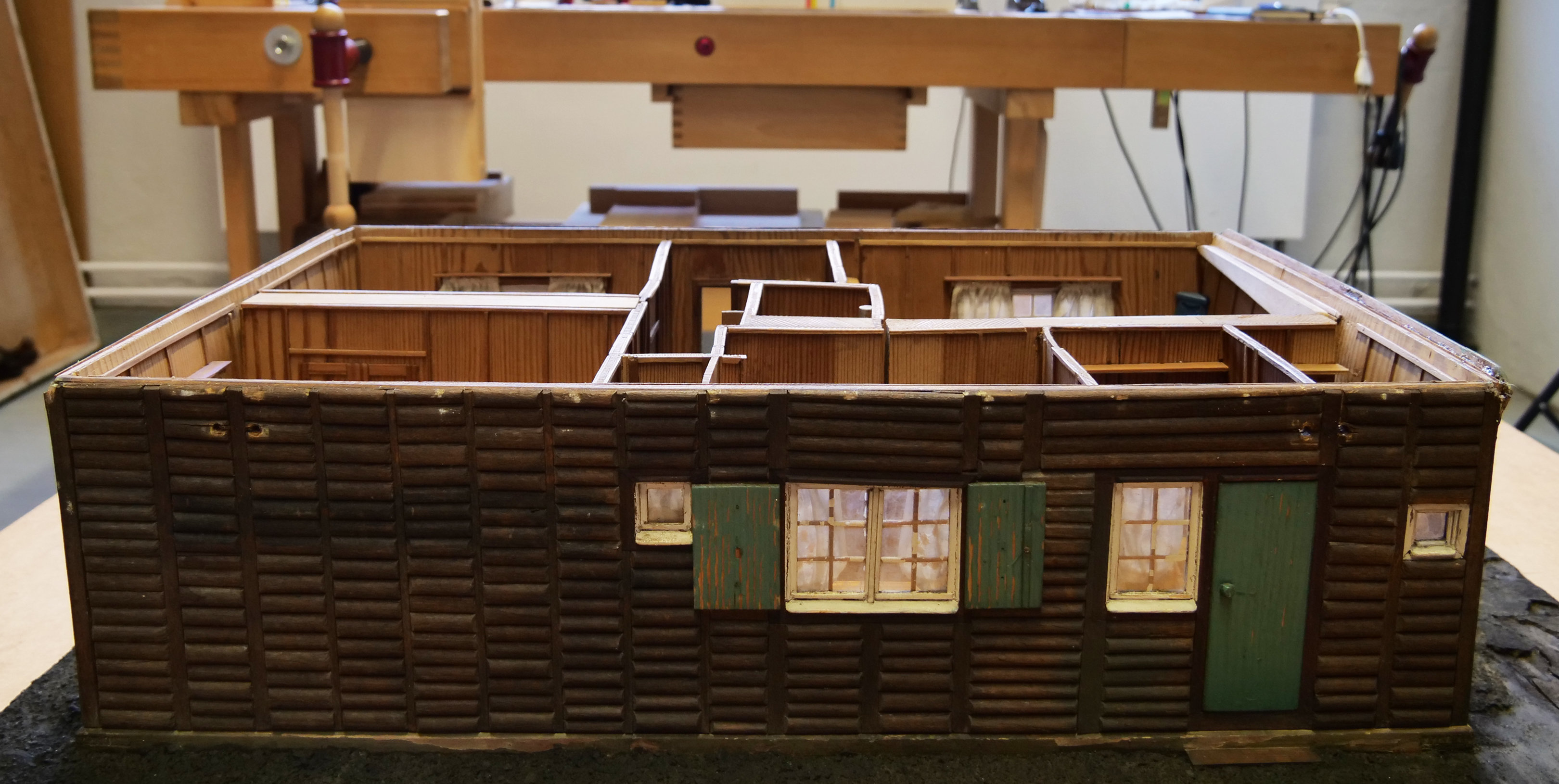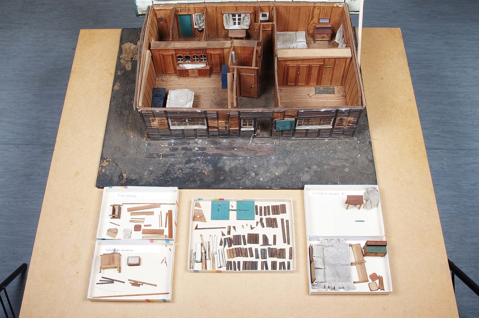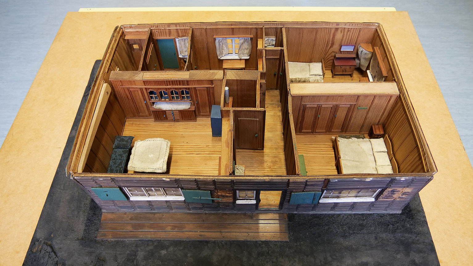 Mit Modellen hat das Unternehmen früher häufig gearbeitet – in diesem Fall des Holzhauses vermutlich zur Ansicht in den externen Verkaufsstellen. Für die bessere Vorstellungskraft zeigte das Modell nicht nur die äußere Hülle, sondern ließ auch einen Blick ins Innere zu. Das Dach ist aufklappbar und offenbart die Räume des Erdgeschosses samt Schrankwand, Betten, Nachttischen, Vorhängen und vielen weiteren kleinen Details.