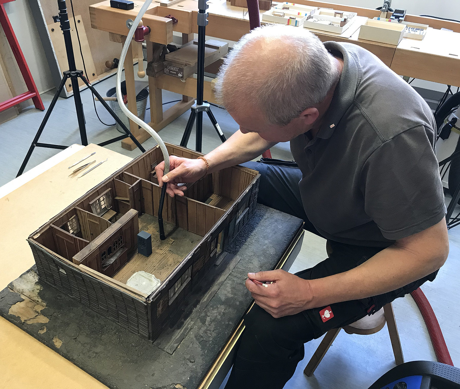 Dieses Modell ist jetzt im Rahmen der Sonderausstellung „Tabakrausch an der Elbe. Geschichten zwischen Orient und Okzident“ der Museen der Stadt zu besichtigen. Zuvor hat Museumsrestaurator Holger Meyer-Doberenz rund vier Wochen investiert, um es wieder in einen guten Zustand zu bringen. Dafür hat er es mit feinen Saugwerkzeugen, Pinseln und Schwämmen gereinigt, lose Teile befestigt und fehlende Einzelteile ergänzt. Außerdem hat er die Außenwände, von denen sich teilweise das Furnier abgelöst hatte, bearbeitet.