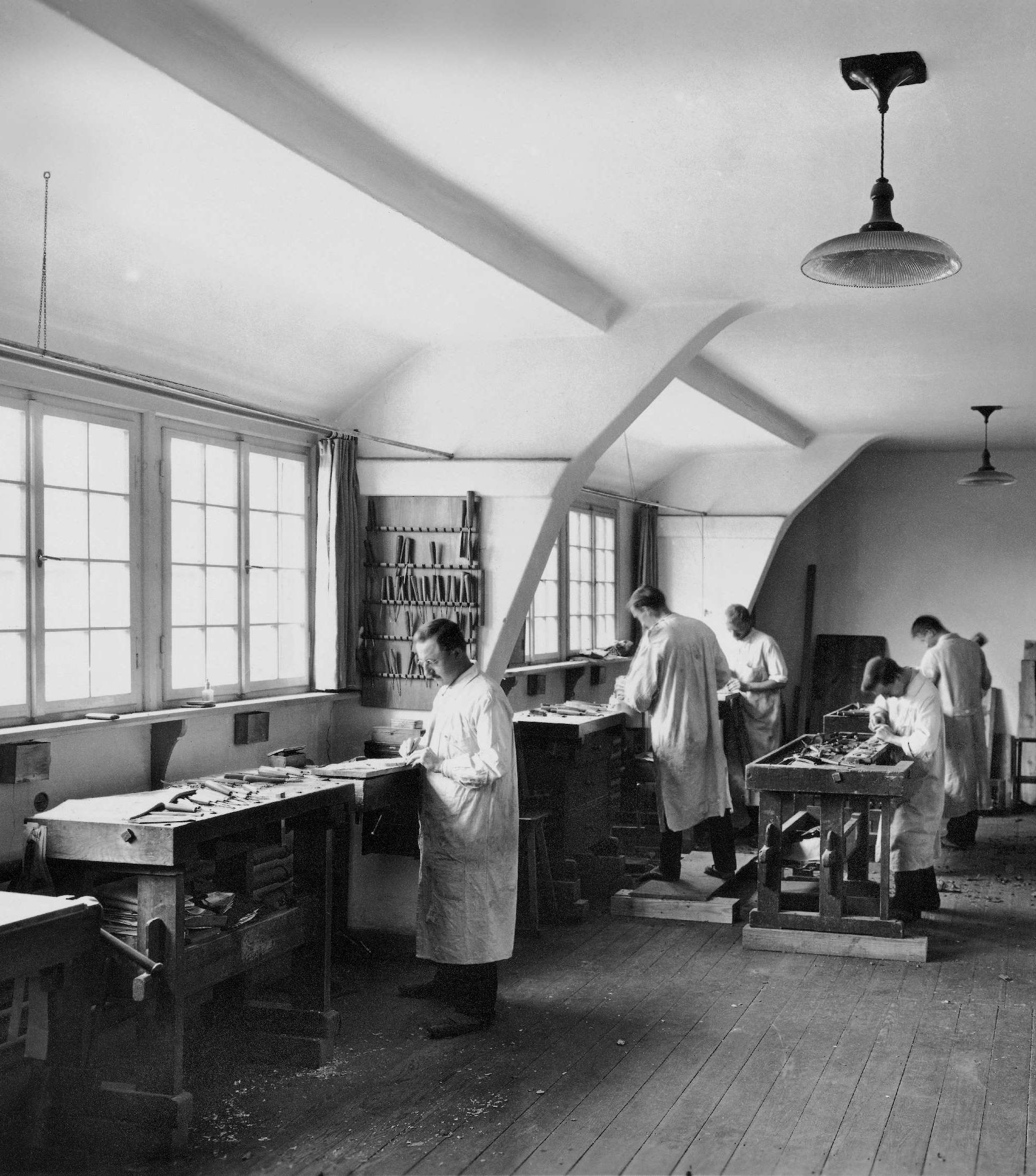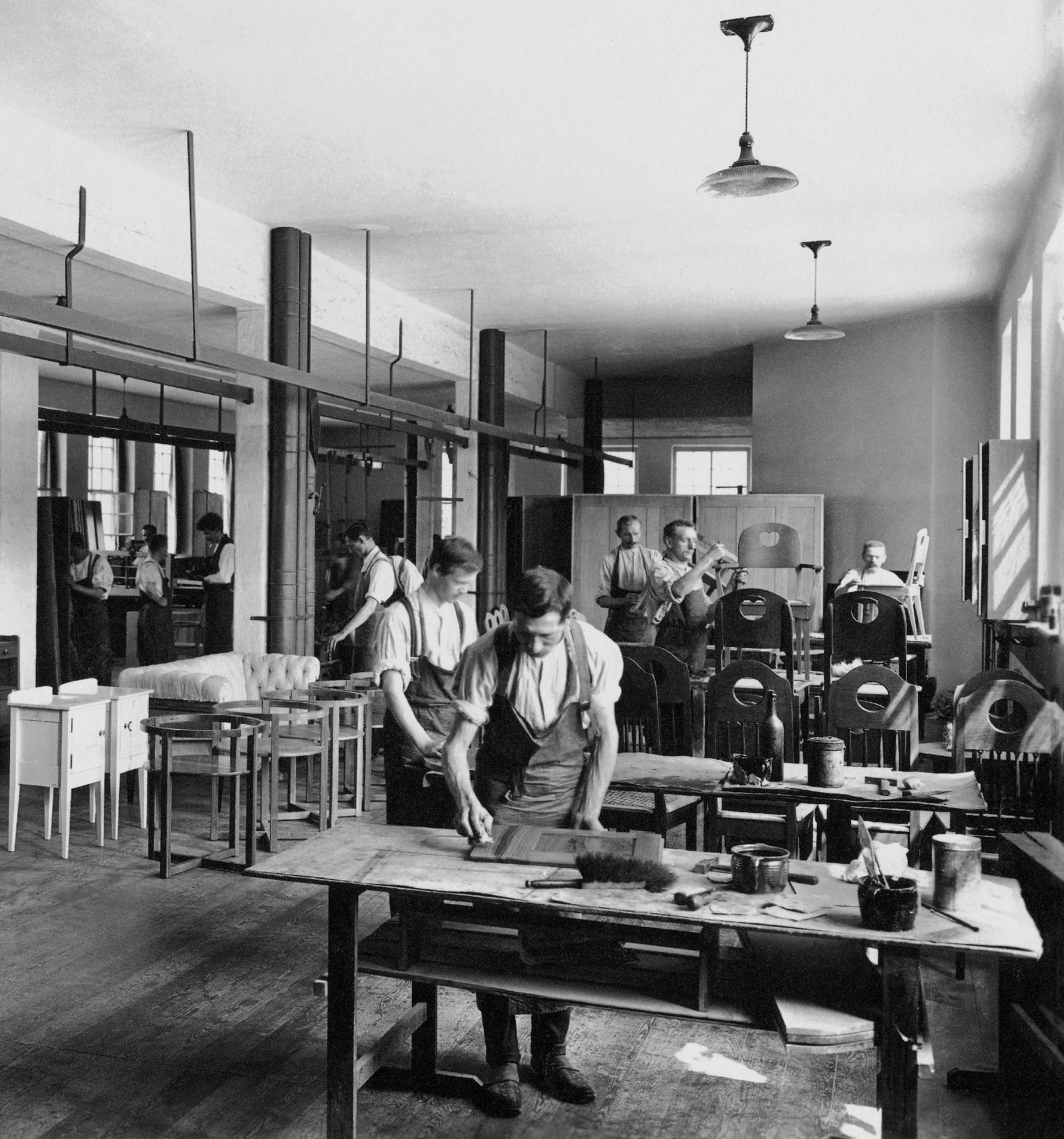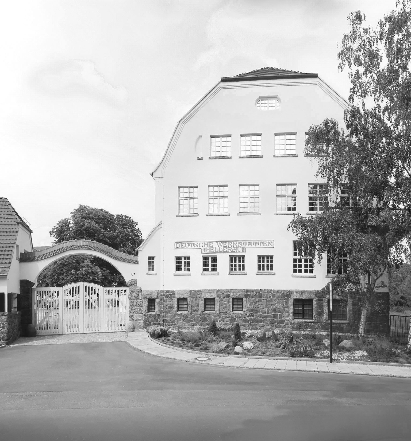 Als Karl Schmidt 1909 mit dem Bau seiner ersten eigenen Fabrik am heutigen Hauptsitz in Dresden-Hellerau begann, hatte er nicht nur die effiziente Fertigung im Blick, sondern auch das Wohl der Arbeiter in den Deutschen Werkstätten. Die Arbeitsplätze waren über die Maßen gut belichtet, es gab Span- und Staubabsauganlagen. Absolut ungewöhnlich für die Zeit: Schmidt ließ auch Sozialräume einrichten. Damit nahm er Errungenschaften des späteren 20. Jahrhunderts voraus.