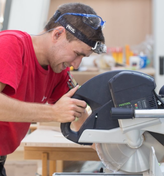 Für die jungen Möbeltischler ist es ein Belastungstest, da sie in einer unbekannten Umgebung vor neugierigen Zuschauern zeigen müssen, was sie unter Zeitdruck leisten können. Für uns wiederum ist es eine interessante Abwechslung vom Arbeitsalltag. Vor allem unsere Auszubildenden staunen nicht schlecht darüber, wie schnell und präzise die Grundtechniken des Tischlerhandwerks bei intensivem Training durchgeführt werden können. Aber auch viele der erfahrenen Mitarbeiter schauen regelmäßig vorbei und verfolgen das kontrolliert-hektische Treiben mit kritischer und gleichzeitig respektvoller Miene.