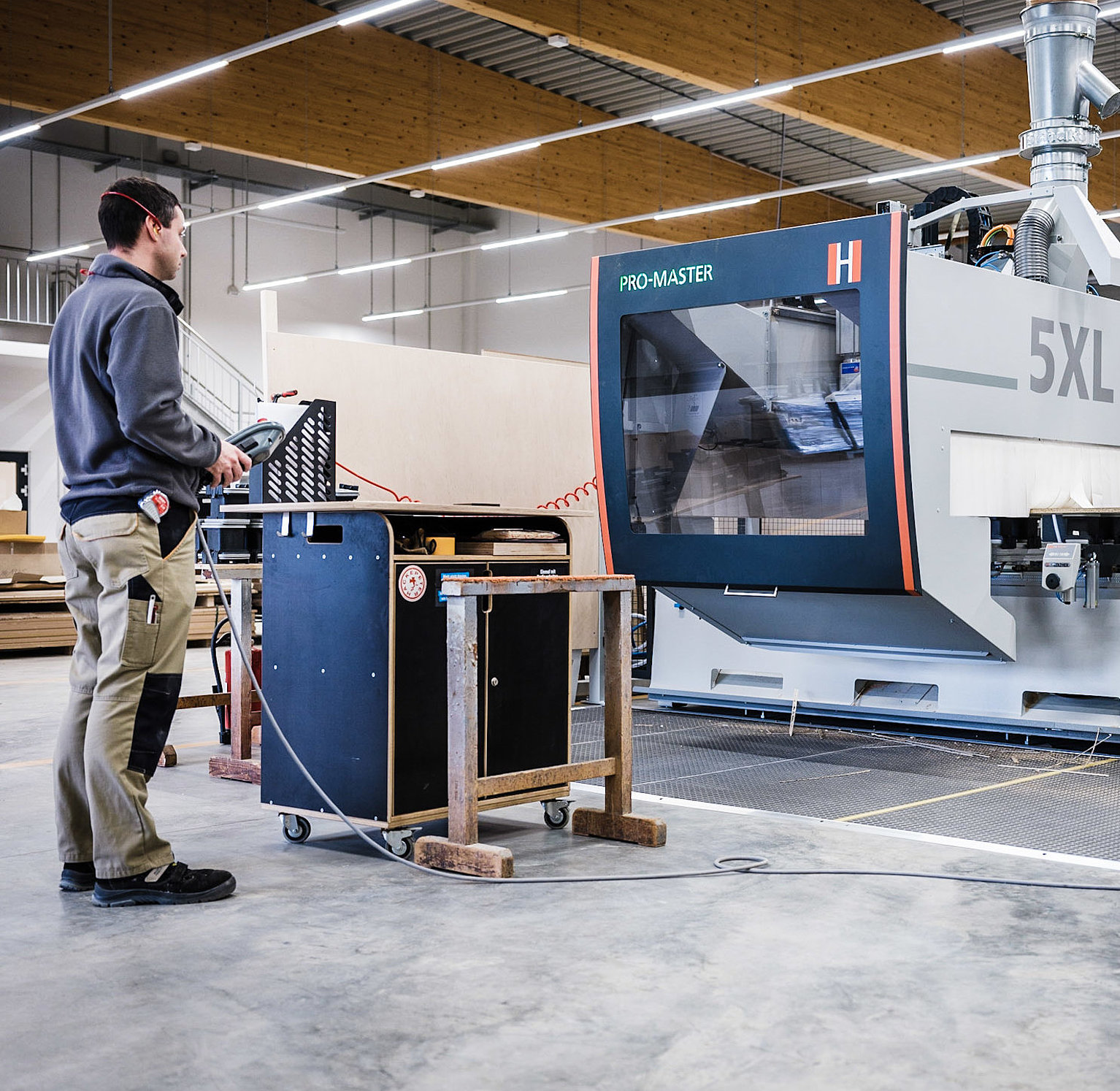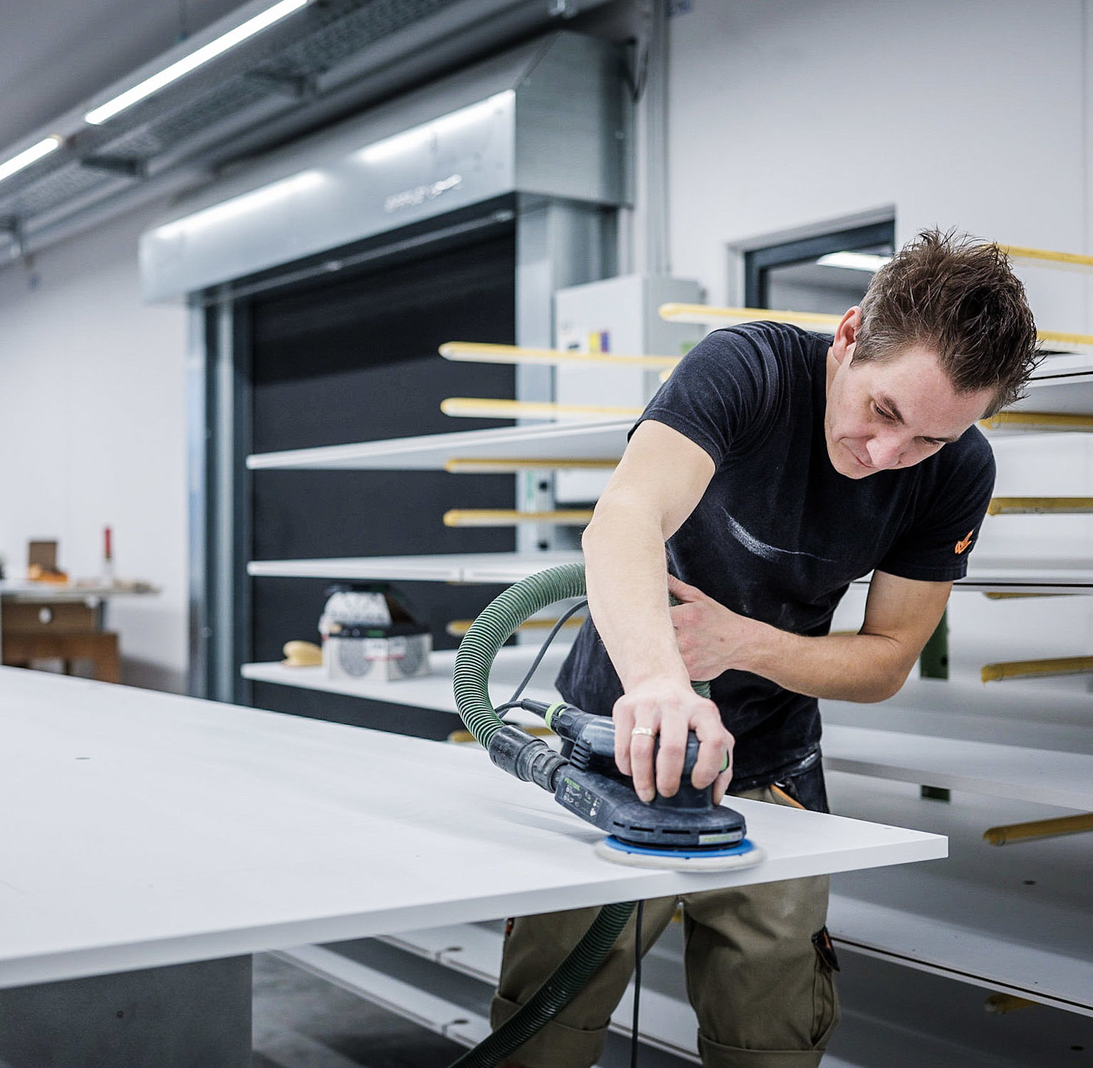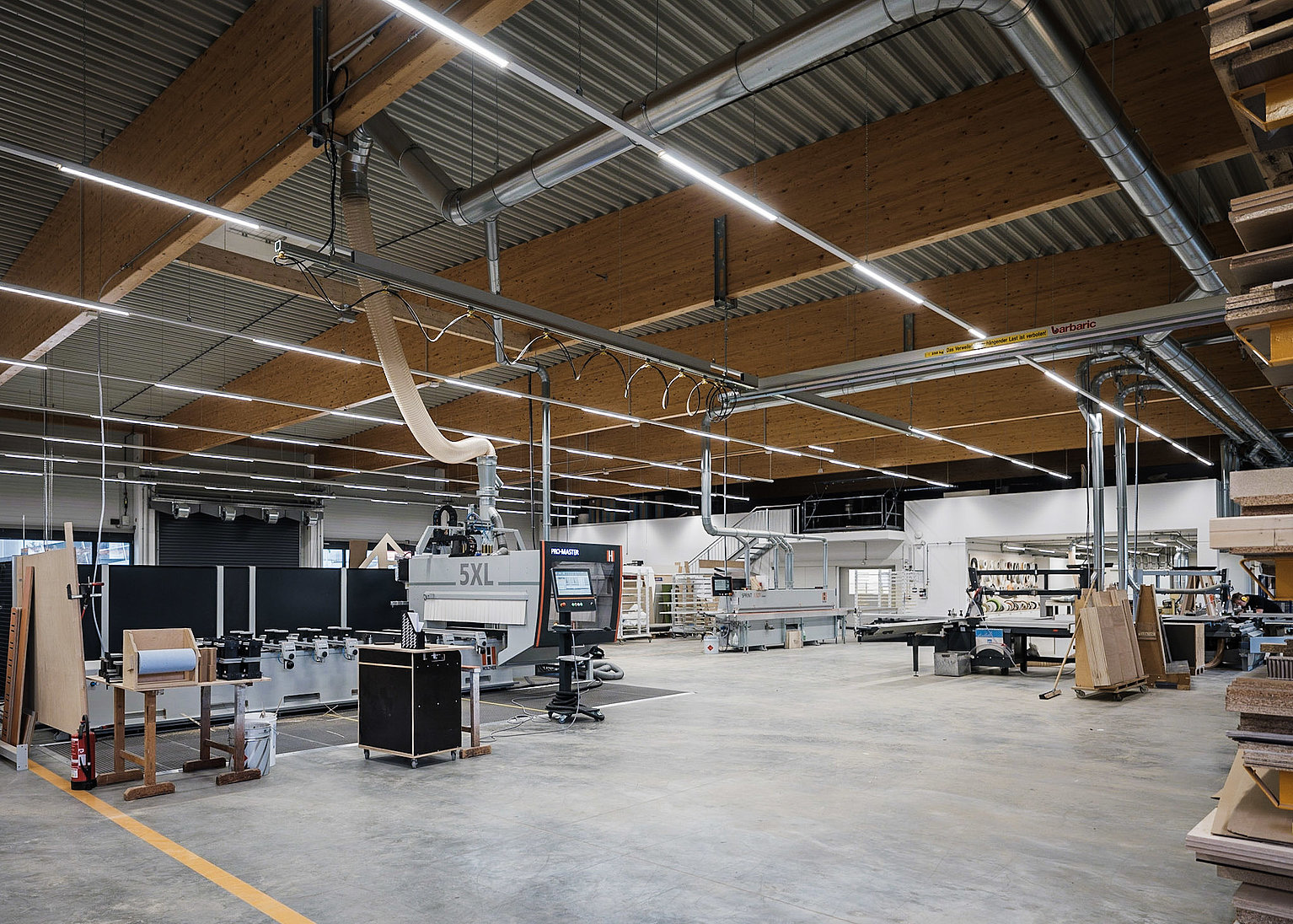 Die Deutschen Werkstätten wachsen. Besonders bei Architekten spricht sich die ganzheitliche Planungsmethode des Unternehmens herum. Deshalb erfolgt die Fertigung für Hochbauprojekte künftig an einem neuen, separaten Standort. In Großröhrsdorf, 30 Kilometer von Dresden-Hellerau entfernt, wurde im Gewerbegebiet ein Grundstück mit 20000 Quadratmeter Fläche erworben, um dort eine neue Fertigungshalle mit Bürotrakt zu errichten. Zunächst war vorgesehen, dort ab Frühjahr 2020 mit zehn Tischlern der Produktionsgesellschaft DW Ohorn zu starten. Doch innerhalb von wenigen Wochen änderte sich die Situation. Die Nachricht von der Insolvenz einer Tischlerei in der Nähe bedeutete für die Deutschen Werkstätten die Möglichkeit, gut ausgebildete Fachkräfte zu übernehmen. „On the job“, im laufenden Betrieb, wurden die neuen Kollegen fortgebildet und ins Unternehmen integriert. Anstelle von zehn Mitarbeitern sind es nun also 25 Kollegen.