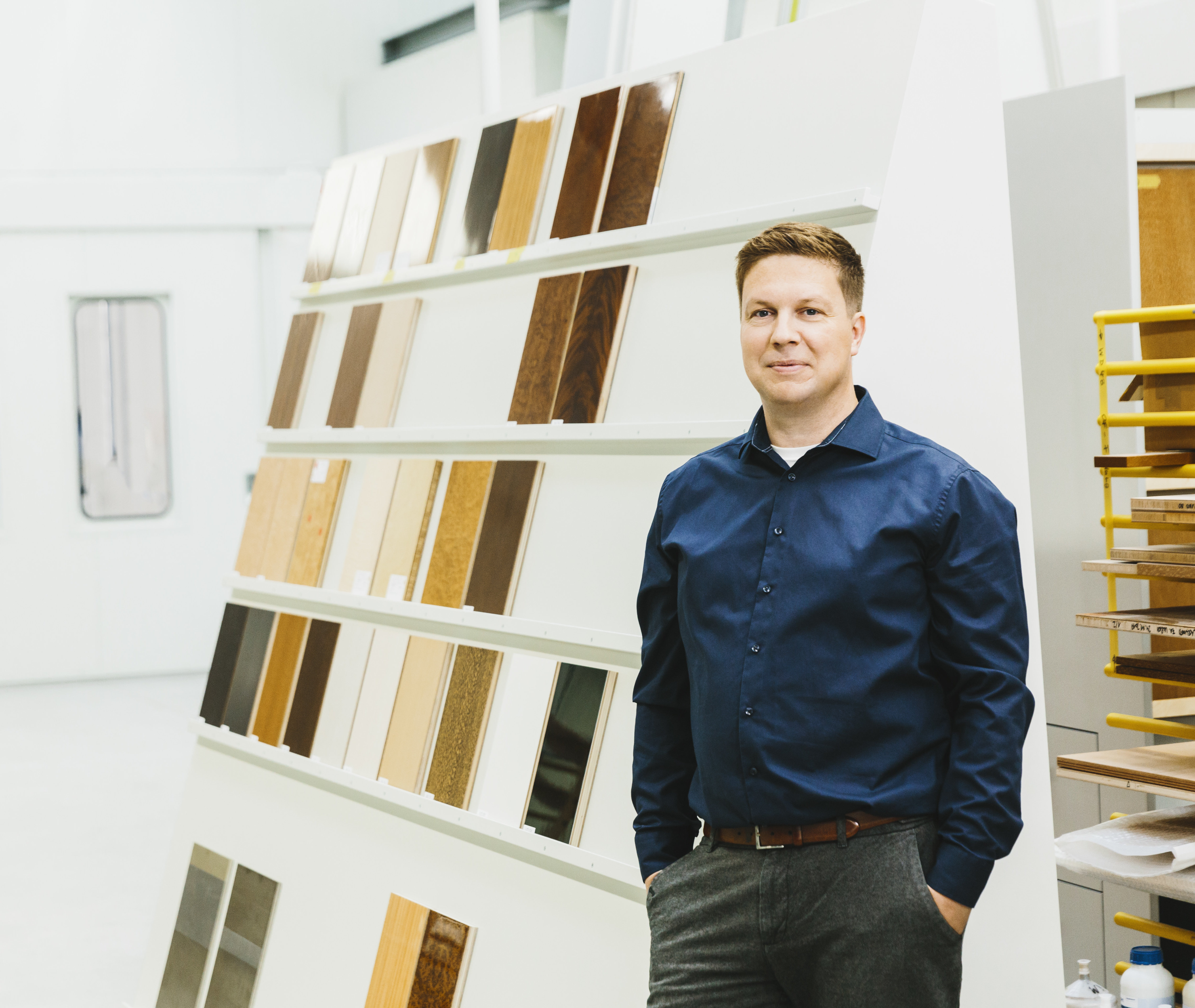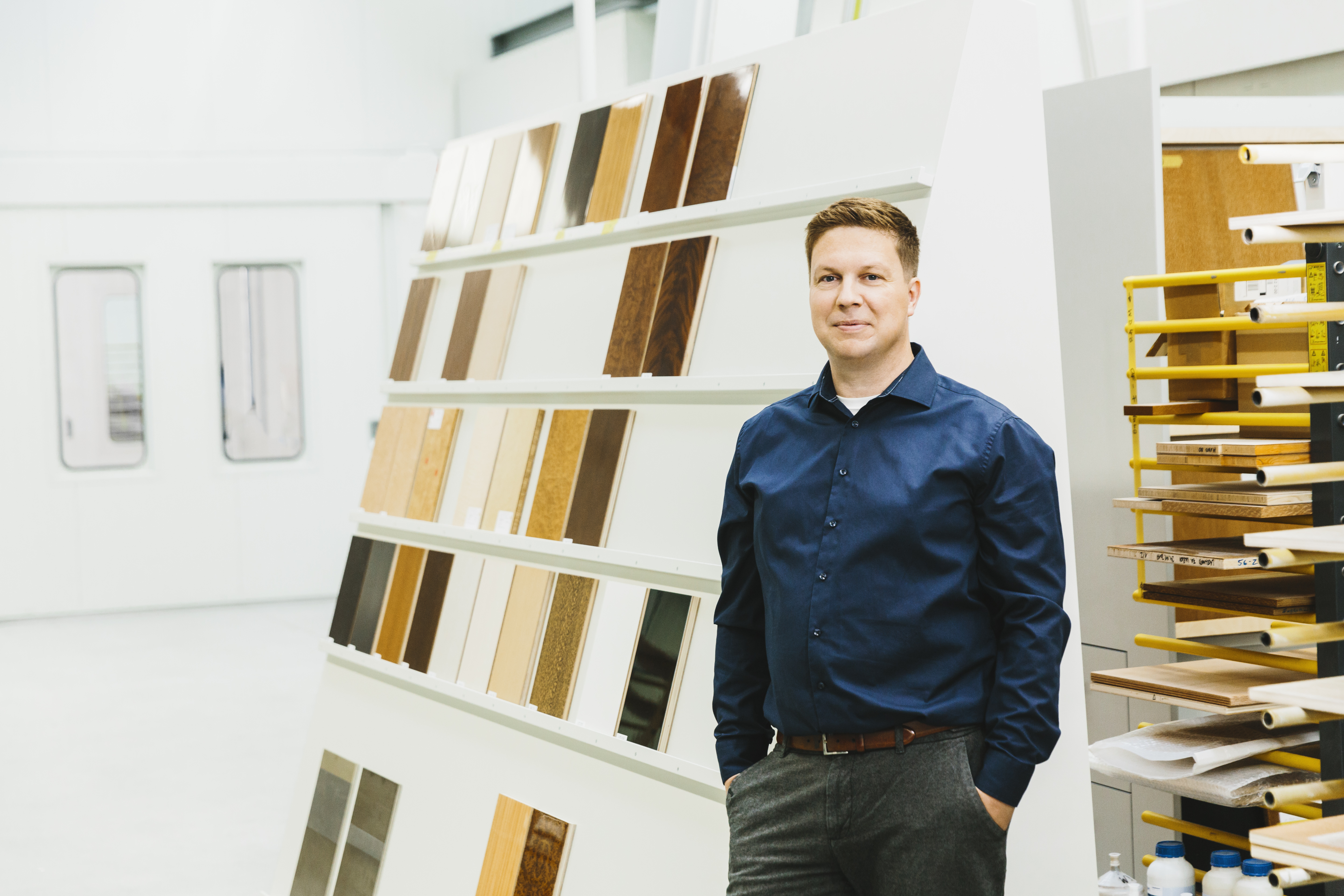 Helge Thielbein, Leiter der Forschungs- und Entwicklungsabteilung, hat kein Lieblingsmaterial - er liebt alle Materialien. Genau das ist es auch, was ihn so eng mit den Deutschen Werkstätten verbindet. "So ein großes Spektrum an Materialien, das es mit außergewöhnlichen Designentwürfen zu verbinden gilt, gibt es nirgendwo sonst. jedenfalls nicht in einer Tischlerei." Thielbein ist gelernter Bau- und Möbeltischler. Nach der Lehre in seiner Heimatstadt Aschersleben hat er sieben Jahre in einem Berliner Unternehmen als Tischler und Lackierer verbracht. Eine Zeit, die er nicht missen möchte. "Die praktische Erfahrung ist bis heute ein großer Fundus für mich. Ich habe dadurch ein besseres Verständnis für die Probleme der Kolelgen in der Fertigung." Nach dem Studium der Holztechnik stieß Thielbein im jahr 2010 zur Abteilung Forschung und Entwicklung (F&E) der Deutschen Werkstätten. Hier ist er zuständig für Materialtests, die Erarbeitung reproduzierbarer Technologien, aber auch für Umweltfragen, so etwa, wenn er die obligatorische Lösemittelbilanz des Unternehmens erstellt.